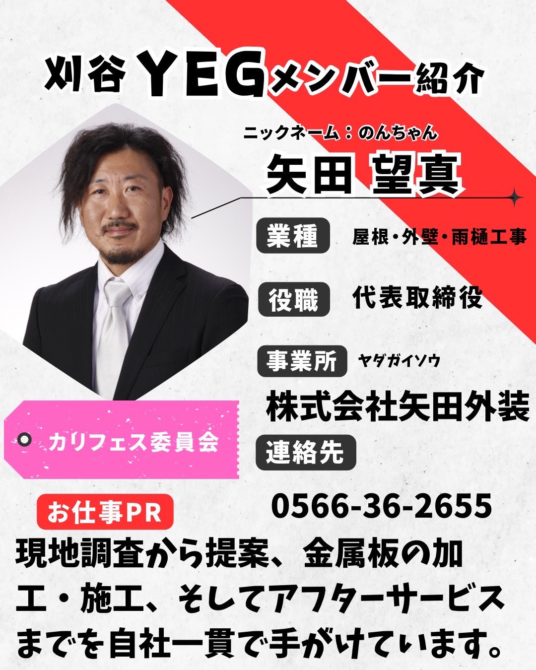 職業一覧 刈谷YEGには多様な職業のメンバーが所属しています。 製造業 自動車関連業 建設・不動産業 運輸・輸送業 情報通信業 広告業 飲食業 卸売・小売業 趣味・レジャー業 美容・健康業 医療・福祉業 金融・保険業 冠婚葬祭・イベント業 サービス全般・その他 メンバー企業紹介 株式会社CFPB 不動産業 刈谷市 はんこ屋さん21 印象・印刷全般製造販売業 刈谷市 the ROYAL 飲食業 刈谷市桜町 株式会社矢田外装 屋根・外壁・雨樋工事業 東海スマート企業グループ株式会社 LPガス販売・建設不動産・住宅・食品販売・養鶏・ホテル業 上田電気工業 電気工事業 Vinculum 多角的事業 (有) 大幸 警備業 エルエム ホールディングス LM HOLDINGS株式会社 警備業 bar ber OttO 理容業 BO: DIO PERSONAL BODY MAKE (ボディオパーソナルボデイメイク) パーソナルジム 宮田建材店 建設業 1234… 会員情報変更はこちらから