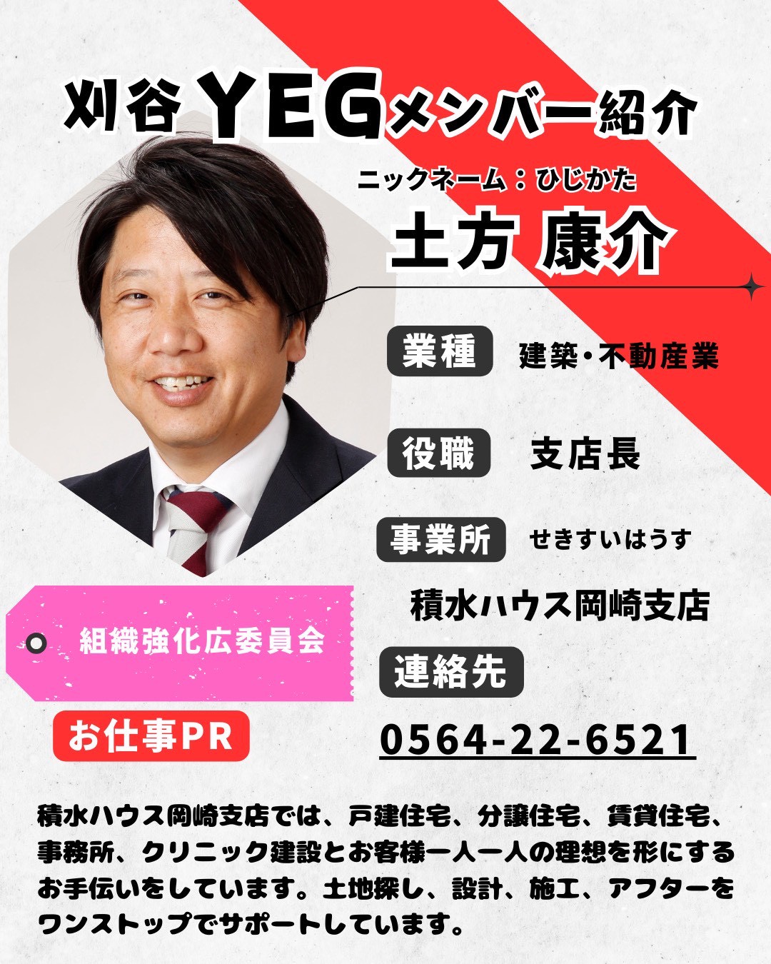職業一覧 刈谷YEGには多様な職業のメンバーが所属しています。 製造業 自動車関連業 建設・不動産業 運輸・輸送業 情報通信業 広告業 飲食業 卸売・小売業 趣味・レジャー業 美容・健康業 医療・福祉業 金融・保険業 冠婚葬祭・イベント業 サービス全般・その他 メンバー企業紹介 株式会社丸重サービス 建設業 (有)伊藤板金工作所 建設業 明治安田(相)刈谷南営業所 生命保険業 マッスルアップ 建設業 株式会社MTカンパニー 飲食業 刈谷市桜町 金寿司・縁紀 飲食業・不用品回収業 株式会社Delight 飲食業 クリイト株式会社 保険業 member’s emma 飲食業 刈谷市桜町 明治安田生命 保険業 積水ハウス岡崎支店 建築・不動産業 岡崎市 イカイ敷物店 内装工事業 12345… 会員情報変更はこちらから