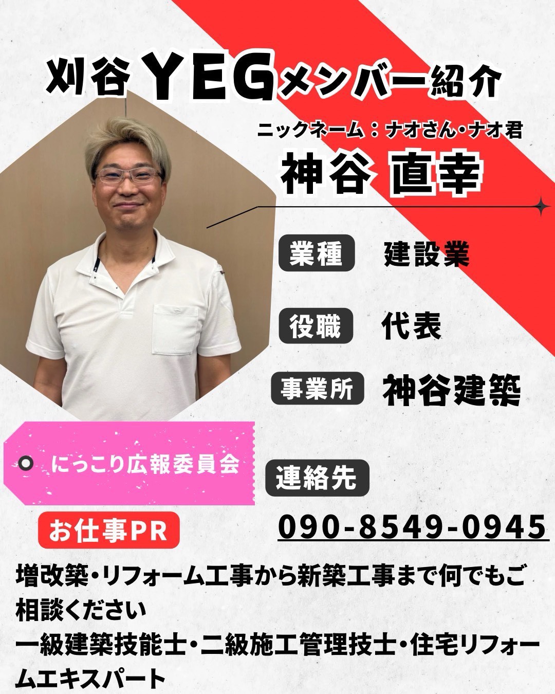 職業一覧 刈谷YEGには多様な職業のメンバーが所属しています。 製造業 自動車関連業 建設・不動産業 運輸・輸送業 情報通信業 広告業 飲食業 卸売・小売業 趣味・レジャー業 美容・健康業 医療・福祉業 金融・保険業 冠婚葬祭・イベント業 サービス全般・その他 メンバー企業紹介 ふじい工務店株式会社 建設業 〒448-0803 愛知県刈谷市野田町東屋敷4-1ルミエールⅢ101 矢田外装 建設業 愛知県刈谷市今川町井田61番地 Google MAP 宮田建材店 建材業 〒448-0803 刈谷市野田町北屋敷158-1 平野工務店 建設業 〒448-0813 愛知県刈谷市小垣江町東王地41 (有)大泉建設 建設業 愛知県刈谷市新富町5-607-4 Google MAP (株)庭 昭 造園業 愛知県刈谷市小垣江町石ノ戸26-1 Google MAP (有)住まいるサービス リフォーム業 愛知県刈谷市司町8-32-2 Google MAP 地建興業 株式会社 建設業 〒448-0810 刈谷市場割町1-4-1 近藤電工 電気工事、電気通信工事 〒470-1154 豊明市新栄町3-281 Rain.房Reform 雨漏りに関する工事 〒448-0813 刈谷市小垣江町大高70 GoogleMap (株)朝長住宅設備 配管工事業 〒448-0843 刈谷市新栄町6-13-2 神谷建築 建築業 〒448-0812 刈谷市高須町1-26-22 GoogleMap 45678… 会員情報変更はこちらから